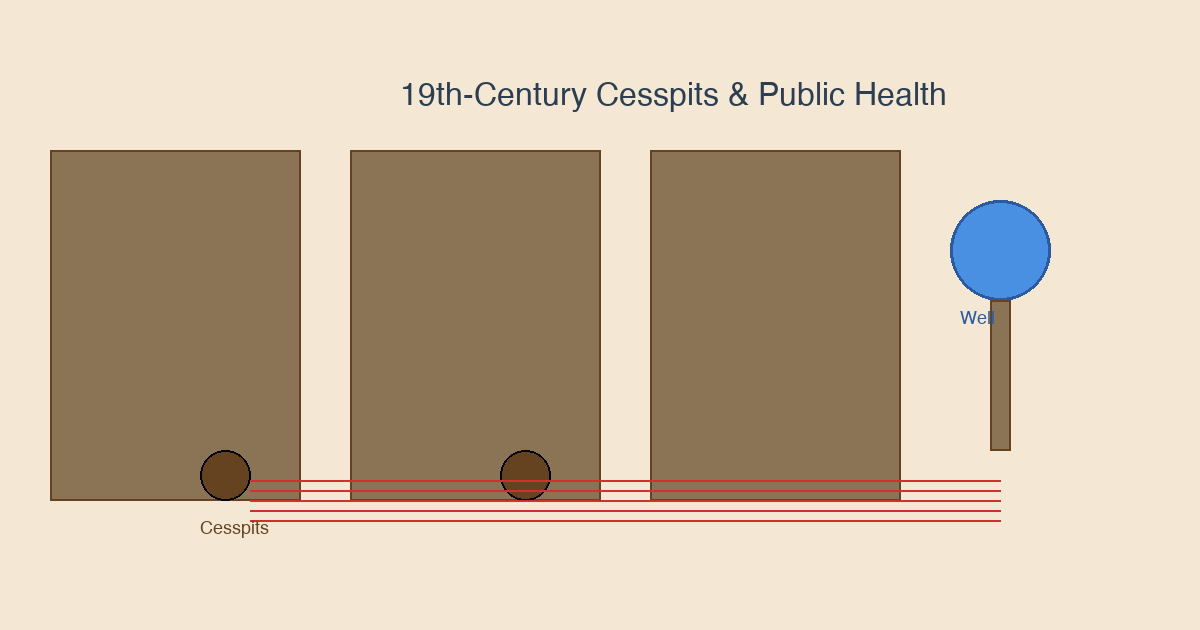 Urban density and public health: In densely populated 19th-century cities, cesspits were often located close together, creating concentrated contamination zones. During disease outbreaks, the proximity of cesspits to homes, wells, and public spaces accelerated disease transmission, making cesspits a significant factor in public health crises.