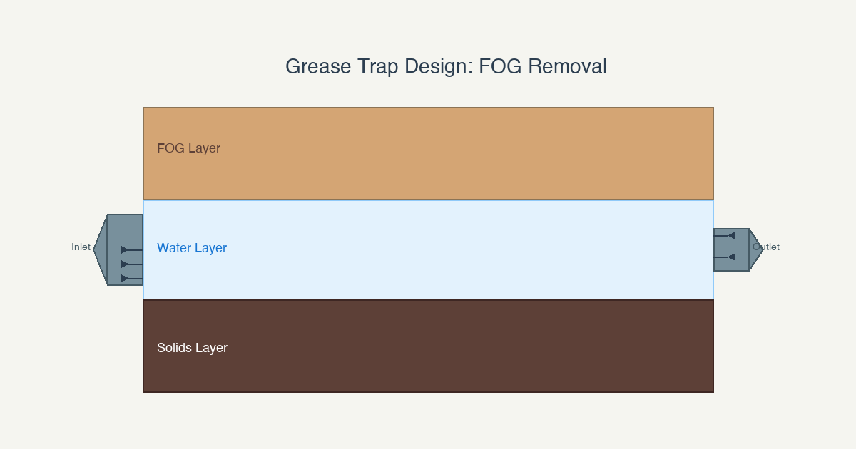 Retention time: Effective FOG removal requires sufficient retention time for gravity separation to occur. The University of Florida IFAS Extension explains that properly designed grease traps provide enough time for FOG to rise to the surface and solids to settle, typically requiring a minimum retention time based on flow rate and trap volume.