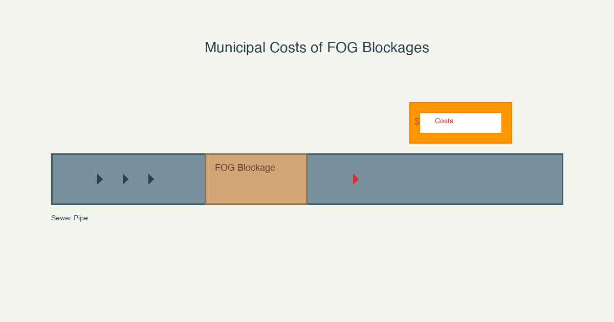 FOG (fats, oils, and grease) from commercial kitchens enters municipal sewer systems when grease traps are improperly maintained or not installed. As FOG cools in sewer pipes, it solidifies and accumulates, creating blockages that restrict flow, cause backups, and can lead to sewage overflows into streets, waterways, and properties.