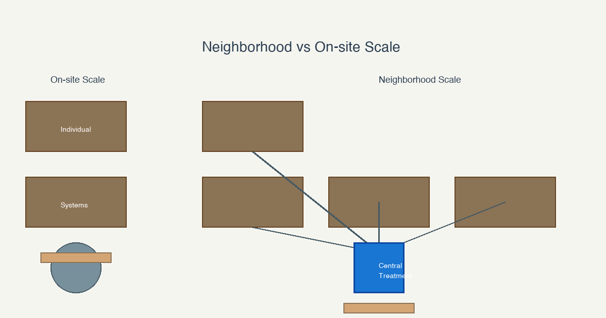 Cost considerations: On-site systems typically have lower initial costs per property but require individual maintenance. Neighborhood-scale systems may have higher initial costs but can be more cost-effective for multiple properties when shared infrastructure reduces per-property costs. The EPA explains that cost analysis should consider both initial and long-term operational costs.